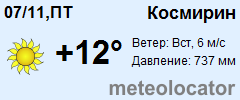 Представляем прогноз погоды в Космирине на 3 дня (сегодня, завтра и послезавтра). Подробнее...Щелкните на соответствующем дне, чтобы получить подробный прогноз по нему. Для просмотра расширенных данных щелкните по заголовку соответствующего блока из группы блоков, расплолженных ниже основного прогноза. Для получения данных на другие дни используйте стрелки слева и справа от таблицы или навигационное меню в левой колонке страницы. Свернуть