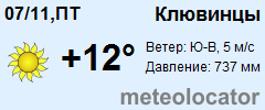 Представляем прогноз погоды в Клювинцах на 3 дня (сегодня, завтра и послезавтра). Подробнее...Щелкните на соответствующем дне, чтобы получить подробный прогноз по нему. Для просмотра расширенных данных щелкните по заголовку соответствующего блока из группы блоков, расплолженных ниже основного прогноза. Для получения данных на другие дни используйте стрелки слева и справа от таблицы или навигационное меню в левой колонке страницы. Свернуть