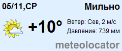 Представляем прогноз погоды в Мильно на 3 дня (сегодня, завтра и послезавтра). Подробнее...Щелкните на соответствующем дне, чтобы получить подробный прогноз по нему. Для просмотра расширенных данных щелкните по заголовку соответствующего блока из группы блоков, расплолженных ниже основного прогноза. Для получения данных на другие дни используйте стрелки слева и справа от таблицы или навигационное меню в левой колонке страницы. Свернуть