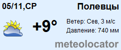 Представляем прогноз погоды в Полевцах на 3 дня (сегодня, завтра и послезавтра). Подробнее...Щелкните на соответствующем дне, чтобы получить подробный прогноз по нему. Для просмотра расширенных данных щелкните по заголовку соответствующего блока из группы блоков, расплолженных ниже основного прогноза. Для получения данных на другие дни используйте стрелки слева и справа от таблицы или навигационное меню в левой колонке страницы. Свернуть