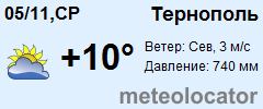 Представляем прогноз погоды в Тернополе на 3 дня (сегодня, завтра и послезавтра). Подробнее...Щелкните на соответствующем дне, чтобы получить подробный прогноз по нему. Для просмотра расширенных данных щелкните по заголовку соответствующего блока из группы блоков, расплолженных ниже основного прогноза. Для получения данных на другие дни используйте стрелки слева и справа от таблицы или навигационное меню в левой колонке страницы. Свернуть