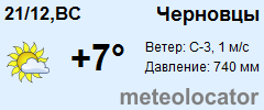 Представляем прогноз погоды в Черновцах на 3 дня (сегодня, завтра и послезавтра). Подробнее...Щелкните на соответствующем дне, чтобы получить подробный прогноз по нему. Для просмотра расширенных данных щелкните по заголовку соответствующего блока из группы блоков, расплолженных ниже основного прогноза. Для получения данных на другие дни используйте стрелки слева и справа от таблицы или навигационное меню в левой колонке страницы. Свернуть