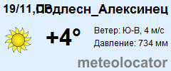 Представляем прогноз погоды в Подлесном Алексинце на 3 дня (сегодня, завтра и послезавтра). Подробнее...Щелкните на соответствующем дне, чтобы получить подробный прогноз по нему. Для просмотра расширенных данных щелкните по заголовку соответствующего блока из группы блоков, расплолженных ниже основного прогноза. Для получения данных на другие дни используйте стрелки слева и справа от таблицы или навигационное меню в левой колонке страницы. Свернуть