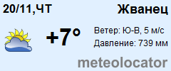 Представляем прогноз погоды в Жванце на 3 дня (сегодня, завтра и послезавтра). Подробнее...Щелкните на соответствующем дне, чтобы получить подробный прогноз по нему. Для просмотра расширенных данных щелкните по заголовку соответствующего блока из группы блоков, расплолженных ниже основного прогноза. Для получения данных на другие дни используйте стрелки слева и справа от таблицы или навигационное меню в левой колонке страницы. Свернуть