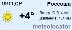 Представляем прогноз погоды в Россоше на 3 дня (сегодня, завтра и послезавтра). Подробнее...Щелкните на соответствующем дне, чтобы получить подробный прогноз по нему. Для просмотра расширенных данных щелкните по заголовку соответствующего блока из группы блоков, расплолженных ниже основного прогноза. Для получения данных на другие дни используйте стрелки слева и справа от таблицы или навигационное меню в левой колонке страницы. Свернуть