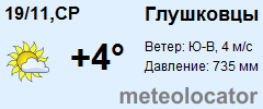 Представляем прогноз погоды в Глушковцах на 3 дня (сегодня, завтра и послезавтра). Подробнее...Щелкните на соответствующем дне, чтобы получить подробный прогноз по нему. Для просмотра расширенных данных щелкните по заголовку соответствующего блока из группы блоков, расплолженных ниже основного прогноза. Для получения данных на другие дни используйте стрелки слева и справа от таблицы или навигационное меню в левой колонке страницы. Свернуть