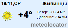 Представляем прогноз погоды в Жилинцах на 3 дня (сегодня, завтра и послезавтра). Подробнее...Щелкните на соответствующем дне, чтобы получить подробный прогноз по нему. Для просмотра расширенных данных щелкните по заголовку соответствующего блока из группы блоков, расплолженных ниже основного прогноза. Для получения данных на другие дни используйте стрелки слева и справа от таблицы или навигационное меню в левой колонке страницы. Свернуть