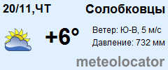 Представляем прогноз погоды в Солобковцах на 3 дня (сегодня, завтра и послезавтра). Подробнее...Щелкните на соответствующем дне, чтобы получить подробный прогноз по нему. Для просмотра расширенных данных щелкните по заголовку соответствующего блока из группы блоков, расплолженных ниже основного прогноза. Для получения данных на другие дни используйте стрелки слева и справа от таблицы или навигационное меню в левой колонке страницы. Свернуть