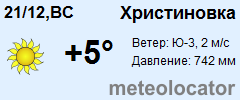 Представляем прогноз погоды в Христиновке на 3 дня (сегодня, завтра и послезавтра). Подробнее...Щелкните на соответствующем дне, чтобы получить подробный прогноз по нему. Для просмотра расширенных данных щелкните по заголовку соответствующего блока из группы блоков, расплолженных ниже основного прогноза. Для получения данных на другие дни используйте стрелки слева и справа от таблицы или навигационное меню в левой колонке страницы. Свернуть
