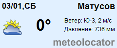 Представляем прогноз погоды в Матусове на 3 дня (сегодня, завтра и послезавтра). Подробнее...Щелкните на соответствующем дне, чтобы получить подробный прогноз по нему. Для просмотра расширенных данных щелкните по заголовку соответствующего блока из группы блоков, расплолженных ниже основного прогноза. Для получения данных на другие дни используйте стрелки слева и справа от таблицы или навигационное меню в левой колонке страницы. Свернуть