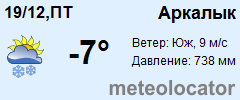 Представляем прогноз погоды в Аркалыке на 3 дня (сегодня, завтра и послезавтра). Подробнее...Щелкните на соответствующем дне, чтобы получить подробный прогноз по нему. Для просмотра расширенных данных щелкните по заголовку соответствующего блока из группы блоков, расплолженных ниже основного прогноза. Для получения данных на другие дни используйте стрелки слева и справа от таблицы или навигационное меню в левой колонке страницы. Свернуть