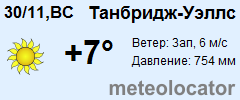 Представляем прогноз погоды в Танбридж-Уэллс на 3 дня (сегодня, завтра и послезавтра). Подробнее...Щелкните на соответствующем дне, чтобы получить подробный прогноз по нему. Для просмотра расширенных данных щелкните по заголовку соответствующего блока из группы блоков, расплолженных ниже основного прогноза. Для получения данных на другие дни используйте стрелки слева и справа от таблицы или навигационное меню в левой колонке страницы. Свернуть