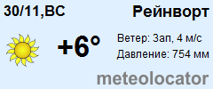 Представляем прогноз погоды в Рейнворте на 3 дня (сегодня, завтра и послезавтра). Подробнее...Щелкните на соответствующем дне, чтобы получить подробный прогноз по нему. Для просмотра расширенных данных щелкните по заголовку соответствующего блока из группы блоков, расплолженных ниже основного прогноза. Для получения данных на другие дни используйте стрелки слева и справа от таблицы или навигационное меню в левой колонке страницы. Свернуть