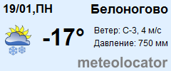 Представляем прогноз погоды в Белоногово на 3 дня (сегодня, завтра и послезавтра). Подробнее...Щелкните на соответствующем дне, чтобы получить подробный прогноз по нему. Для просмотра расширенных данных щелкните по заголовку соответствующего блока из группы блоков, расплолженных ниже основного прогноза. Для получения данных на другие дни используйте стрелки слева и справа от таблицы или навигационное меню в левой колонке страницы. Свернуть