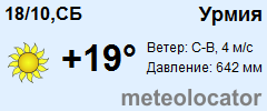 Представляем прогноз погоды в Урмии на 3 дня (сегодня, завтра и послезавтра). Подробнее...Щелкните на соответствующем дне, чтобы получить подробный прогноз по нему. Для просмотра расширенных данных щелкните по заголовку соответствующего блока из группы блоков, расплолженных ниже основного прогноза. Для получения данных на другие дни используйте стрелки слева и справа от таблицы или навигационное меню в левой колонке страницы. Свернуть