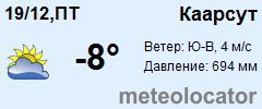 Представляем прогноз погоды в Каарсуте на 3 дня (сегодня, завтра и послезавтра). Подробнее...Щелкните на соответствующем дне, чтобы получить подробный прогноз по нему. Для просмотра расширенных данных щелкните по заголовку соответствующего блока из группы блоков, расплолженных ниже основного прогноза. Для получения данных на другие дни используйте стрелки слева и справа от таблицы или навигационное меню в левой колонке страницы. Свернуть