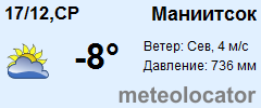 Представляем прогноз погоды в Маниитсоке на 3 дня (сегодня, завтра и послезавтра). Подробнее...Щелкните на соответствующем дне, чтобы получить подробный прогноз по нему. Для просмотра расширенных данных щелкните по заголовку соответствующего блока из группы блоков, расплолженных ниже основного прогноза. Для получения данных на другие дни используйте стрелки слева и справа от таблицы или навигационное меню в левой колонке страницы. Свернуть