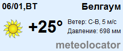Представляем прогноз погоды в Белгауме на 5 - 7 дней. Подробнее...Щелкните на соответствующем дне, чтобы получить подробный прогноз по нему. Для просмотра расширенных данных щелкните по заголовку соответствующего блока из группы блоков, расплолженных ниже основного. Для получения данных на другие дни используйте стрелки слева и справа от таблицы с погодой или навигационное меню в левой колонке страницы. Свернуть