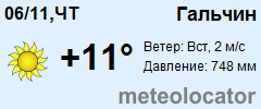 Представляем прогноз погоды в Гальчине на 3 дня (сегодня, завтра и послезавтра). Подробнее...Щелкните на соответствующем дне, чтобы получить подробный прогноз по нему. Для просмотра расширенных данных щелкните по заголовку соответствующего блока из группы блоков, расплолженных ниже основного прогноза. Для получения данных на другие дни используйте стрелки слева и справа от таблицы или навигационное меню в левой колонке страницы. Свернуть
