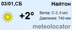Представляем прогноз погоды в Найтоне на 3 дня (сегодня, завтра и послезавтра). Подробнее...Щелкните на соответствующем дне, чтобы получить подробный прогноз по нему. Для просмотра расширенных данных щелкните по заголовку соответствующего блока из группы блоков, расплолженных ниже основного прогноза. Для получения данных на другие дни используйте стрелки слева и справа от таблицы или навигационное меню в левой колонке страницы. Свернуть