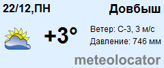 Представляем прогноз погоды в Довбыше на 3 дня (сегодня, завтра и послезавтра). Подробнее...Щелкните на соответствующем дне, чтобы получить подробный прогноз по нему. Для просмотра расширенных данных щелкните по заголовку соответствующего блока из группы блоков, расплолженных ниже основного прогноза. Для получения данных на другие дни используйте стрелки слева и справа от таблицы или навигационное меню в левой колонке страницы. Свернуть