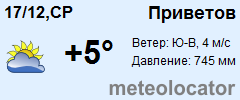 Представляем прогноз погоды в Приветове на 3 дня (сегодня, завтра и послезавтра). Подробнее...Щелкните на соответствующем дне, чтобы получить подробный прогноз по нему. Для просмотра расширенных данных щелкните по заголовку соответствующего блока из группы блоков, расплолженных ниже основного прогноза. Для получения данных на другие дни используйте стрелки слева и справа от таблицы или навигационное меню в левой колонке страницы. Свернуть