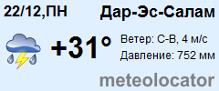 Представляем прогноз погоды в Дар-Эс-Саламе на 3 дня (сегодня, завтра и послезавтра). Подробнее...Щелкните на соответствующем дне, чтобы получить подробный прогноз по нему. Для просмотра расширенных данных щелкните по заголовку соответствующего блока из группы блоков, расплолженных ниже основного прогноза. Для получения данных на другие дни используйте стрелки слева и справа от таблицы или навигационное меню в левой колонке страницы. Свернуть