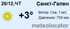 Представляем прогноз погоды в Санкт-Галене на 3 дня (сегодня, завтра и послезавтра). Подробнее...Щелкните на соответствующем дне, чтобы получить подробный прогноз по нему. Для просмотра расширенных данных щелкните по заголовку соответствующего блока из группы блоков, расплолженных ниже основного прогноза. Для получения данных на другие дни используйте стрелки слева и справа от таблицы или навигационное меню в левой колонке страницы. Свернуть
