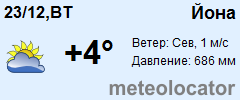 Представляем прогноз погоды в Йоне на 3 дня (сегодня, завтра и послезавтра). Подробнее...Щелкните на соответствующем дне, чтобы получить подробный прогноз по нему. Для просмотра расширенных данных щелкните по заголовку соответствующего блока из группы блоков, расплолженных ниже основного прогноза. Для получения данных на другие дни используйте стрелки слева и справа от таблицы или навигационное меню в левой колонке страницы. Свернуть