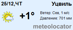 Представляем прогноз погоды в Уцвиле на 3 дня (сегодня, завтра и послезавтра). Подробнее...Щелкните на соответствующем дне, чтобы получить подробный прогноз по нему. Для просмотра расширенных данных щелкните по заголовку соответствующего блока из группы блоков, расплолженных ниже основного прогноза. Для получения данных на другие дни используйте стрелки слева и справа от таблицы или навигационное меню в левой колонке страницы. Свернуть