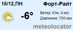 Представляем прогноз погоды в Форте-Райт на 3 дня (сегодня, завтра и послезавтра). Подробнее...Щелкните на соответствующем дне, чтобы получить подробный прогноз по нему. Для просмотра расширенных данных щелкните по заголовку соответствующего блока из группы блоков, расплолженных ниже основного прогноза. Для получения данных на другие дни используйте стрелки слева и справа от таблицы или навигационное меню в левой колонке страницы. Свернуть