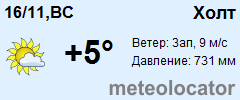 Представляем прогноз погоды в Холте на 3 дня (сегодня, завтра и послезавтра). Подробнее...Щелкните на соответствующем дне, чтобы получить подробный прогноз по нему. Для просмотра расширенных данных щелкните по заголовку соответствующего блока из группы блоков, расплолженных ниже основного прогноза. Для получения данных на другие дни используйте стрелки слева и справа от таблицы или навигационное меню в левой колонке страницы. Свернуть