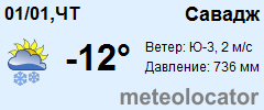 Представляем прогноз погоды в Савадже на 3 дня (сегодня, завтра и послезавтра). Подробнее...Щелкните на соответствующем дне, чтобы получить подробный прогноз по нему. Для просмотра расширенных данных щелкните по заголовку соответствующего блока из группы блоков, расплолженных ниже основного прогноза. Для получения данных на другие дни используйте стрелки слева и справа от таблицы или навигационное меню в левой колонке страницы. Свернуть
