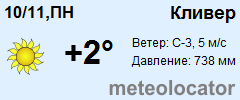 Представляем прогноз погоды в Кливере на 3 дня (сегодня, завтра и послезавтра). Подробнее...Щелкните на соответствующем дне, чтобы получить подробный прогноз по нему. Для просмотра расширенных данных щелкните по заголовку соответствующего блока из группы блоков, расплолженных ниже основного прогноза. Для получения данных на другие дни используйте стрелки слева и справа от таблицы или навигационное меню в левой колонке страницы. Свернуть