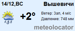 Представляем прогноз погоды в Вышевичах на 3 дня (сегодня, завтра и послезавтра). Подробнее...Щелкните на соответствующем дне, чтобы получить подробный прогноз по нему. Для просмотра расширенных данных щелкните по заголовку соответствующего блока из группы блоков, расплолженных ниже основного прогноза. Для получения данных на другие дни используйте стрелки слева и справа от таблицы или навигационное меню в левой колонке страницы. Свернуть