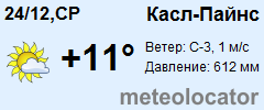 Представляем прогноз погоды в Касл-Пайнсе на 3 дня (сегодня, завтра и послезавтра). Подробнее...Щелкните на соответствующем дне, чтобы получить подробный прогноз по нему. Для просмотра расширенных данных щелкните по заголовку соответствующего блока из группы блоков, расплолженных ниже основного прогноза. Для получения данных на другие дни используйте стрелки слева и справа от таблицы или навигационное меню в левой колонке страницы. Свернуть