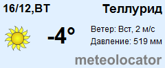 Представляем прогноз погоды в Теллуриде на 3 дня (сегодня, завтра и послезавтра). Подробнее...Щелкните на соответствующем дне, чтобы получить подробный прогноз по нему. Для просмотра расширенных данных щелкните по заголовку соответствующего блока из группы блоков, расплолженных ниже основного прогноза. Для получения данных на другие дни используйте стрелки слева и справа от таблицы или навигационное меню в левой колонке страницы. Свернуть