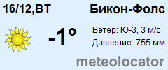 Представляем прогноз погоды в Бикон-Фолс на 3 дня (сегодня, завтра и послезавтра). Подробнее...Щелкните на соответствующем дне, чтобы получить подробный прогноз по нему. Для просмотра расширенных данных щелкните по заголовку соответствующего блока из группы блоков, расплолженных ниже основного прогноза. Для получения данных на другие дни используйте стрелки слева и справа от таблицы или навигационное меню в левой колонке страницы. Свернуть