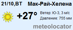 Представляем прогноз погоды в Мак-Рай-Хелене на 3 дня (сегодня, завтра и послезавтра). Подробнее...Щелкните на соответствующем дне, чтобы получить подробный прогноз по нему. Для просмотра расширенных данных щелкните по заголовку соответствующего блока из группы блоков, расплолженных ниже основного прогноза. Для получения данных на другие дни используйте стрелки слева и справа от таблицы или навигационное меню в левой колонке страницы. Свернуть