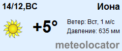 Представляем прогноз погоды в Ионе на 3 дня (сегодня, завтра и послезавтра). Подробнее...Щелкните на соответствующем дне, чтобы получить подробный прогноз по нему. Для просмотра расширенных данных щелкните по заголовку соответствующего блока из группы блоков, расплолженных ниже основного прогноза. Для получения данных на другие дни используйте стрелки слева и справа от таблицы или навигационное меню в левой колонке страницы. Свернуть