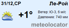 Представляем прогноз погоды в Ле-Рое на 3 дня (сегодня, завтра и послезавтра). Подробнее...Щелкните на соответствующем дне, чтобы получить подробный прогноз по нему. Для просмотра расширенных данных щелкните по заголовку соответствующего блока из группы блоков, расплолженных ниже основного прогноза. Для получения данных на другие дни используйте стрелки слева и справа от таблицы или навигационное меню в левой колонке страницы. Свернуть