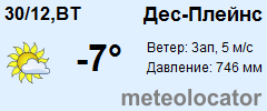 Представляем прогноз погоды в Дес-Плейнс на 3 дня (сегодня, завтра и послезавтра). Подробнее...Щелкните на соответствующем дне, чтобы получить подробный прогноз по нему. Для просмотра расширенных данных щелкните по заголовку соответствующего блока из группы блоков, расплолженных ниже основного прогноза. Для получения данных на другие дни используйте стрелки слева и справа от таблицы или навигационное меню в левой колонке страницы. Свернуть