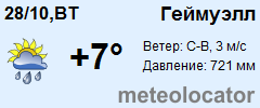 Представляем прогноз погоды в Геймуэлле на 3 дня (сегодня, завтра и послезавтра). Подробнее...Щелкните на соответствующем дне, чтобы получить подробный прогноз по нему. Для просмотра расширенных данных щелкните по заголовку соответствующего блока из группы блоков, расплолженных ниже основного прогноза. Для получения данных на другие дни используйте стрелки слева и справа от таблицы или навигационное меню в левой колонке страницы. Свернуть