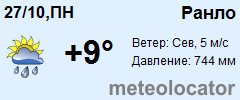 Представляем прогноз погоды в Ранло на 3 дня (сегодня, завтра и послезавтра). Подробнее...Щелкните на соответствующем дне, чтобы получить подробный прогноз по нему. Для просмотра расширенных данных щелкните по заголовку соответствующего блока из группы блоков, расплолженных ниже основного прогноза. Для получения данных на другие дни используйте стрелки слева и справа от таблицы или навигационное меню в левой колонке страницы. Свернуть
