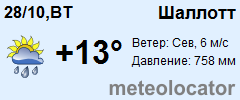Представляем прогноз погоды в Шаллотте на 3 дня (сегодня, завтра и послезавтра). Подробнее...Щелкните на соответствующем дне, чтобы получить подробный прогноз по нему. Для просмотра расширенных данных щелкните по заголовку соответствующего блока из группы блоков, расплолженных ниже основного прогноза. Для получения данных на другие дни используйте стрелки слева и справа от таблицы или навигационное меню в левой колонке страницы. Свернуть