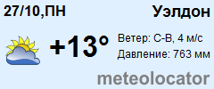 Представляем прогноз погоды в Уэлдоне на 3 дня (сегодня, завтра и послезавтра). Подробнее...Щелкните на соответствующем дне, чтобы получить подробный прогноз по нему. Для просмотра расширенных данных щелкните по заголовку соответствующего блока из группы блоков, расплолженных ниже основного прогноза. Для получения данных на другие дни используйте стрелки слева и справа от таблицы или навигационное меню в левой колонке страницы. Свернуть
