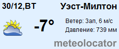 Представляем прогноз погоды в Уэст-Милтоне на 3 дня (сегодня, завтра и послезавтра). Подробнее...Щелкните на соответствующем дне, чтобы получить подробный прогноз по нему. Для просмотра расширенных данных щелкните по заголовку соответствующего блока из группы блоков, расплолженных ниже основного прогноза. Для получения данных на другие дни используйте стрелки слева и справа от таблицы или навигационное меню в левой колонке страницы. Свернуть