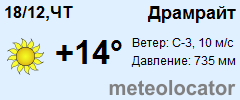 Представляем прогноз погоды в Драмрайте на 3 дня (сегодня, завтра и послезавтра). Подробнее...Щелкните на соответствующем дне, чтобы получить подробный прогноз по нему. Для просмотра расширенных данных щелкните по заголовку соответствующего блока из группы блоков, расплолженных ниже основного прогноза. Для получения данных на другие дни используйте стрелки слева и справа от таблицы или навигационное меню в левой колонке страницы. Свернуть