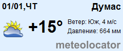 Представляем прогноз погоды в Дюма на 3 дня (сегодня, завтра и послезавтра). Подробнее...Щелкните на соответствующем дне, чтобы получить подробный прогноз по нему. Для просмотра расширенных данных щелкните по заголовку соответствующего блока из группы блоков, расплолженных ниже основного прогноза. Для получения данных на другие дни используйте стрелки слева и справа от таблицы или навигационное меню в левой колонке страницы. Свернуть
