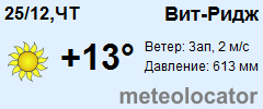 Представляем прогноз погоды в Вит-Ридже на 3 дня (сегодня, завтра и послезавтра). Подробнее...Щелкните на соответствующем дне, чтобы получить подробный прогноз по нему. Для просмотра расширенных данных щелкните по заголовку соответствующего блока из группы блоков, расплолженных ниже основного прогноза. Для получения данных на другие дни используйте стрелки слева и справа от таблицы или навигационное меню в левой колонке страницы. Свернуть